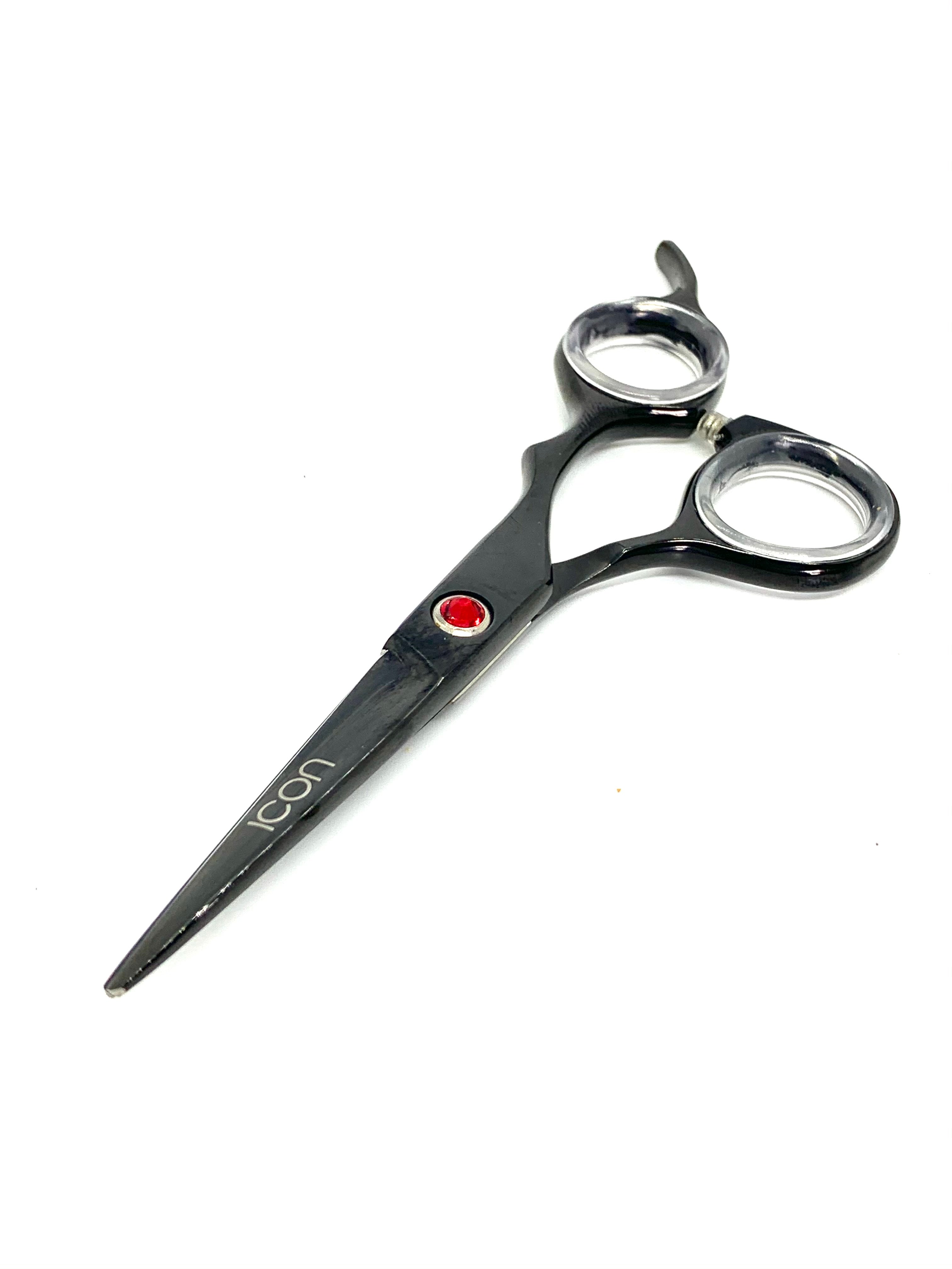 ICON 4.5" Black detail, point cutting shears with fixed finger rest. These shears have an offset handle and are well balanced with a very sharp semi-convex edge. These shears come with a one year blade/edge warranty with one year unlimited sharpening and a lifetime warranty towards any manufacturing defects. 100% handmade by our shears experts.