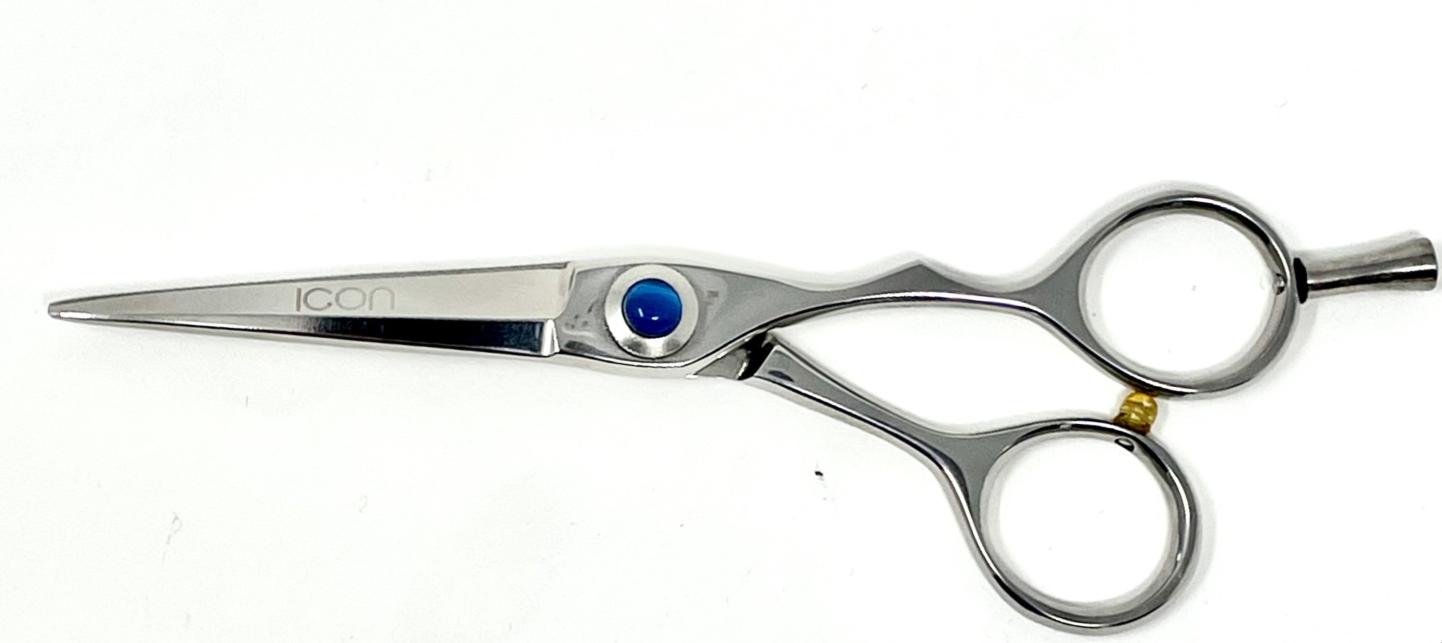 5.5" ICON Chrome titanium shears with removeable finger rest. Semi-convex razor sharp edge with flower design. These shears come with a one year blade/edge warranty which means you will enjoy one year of free unlimited sharpening. 100% handmade by our shears experts.
