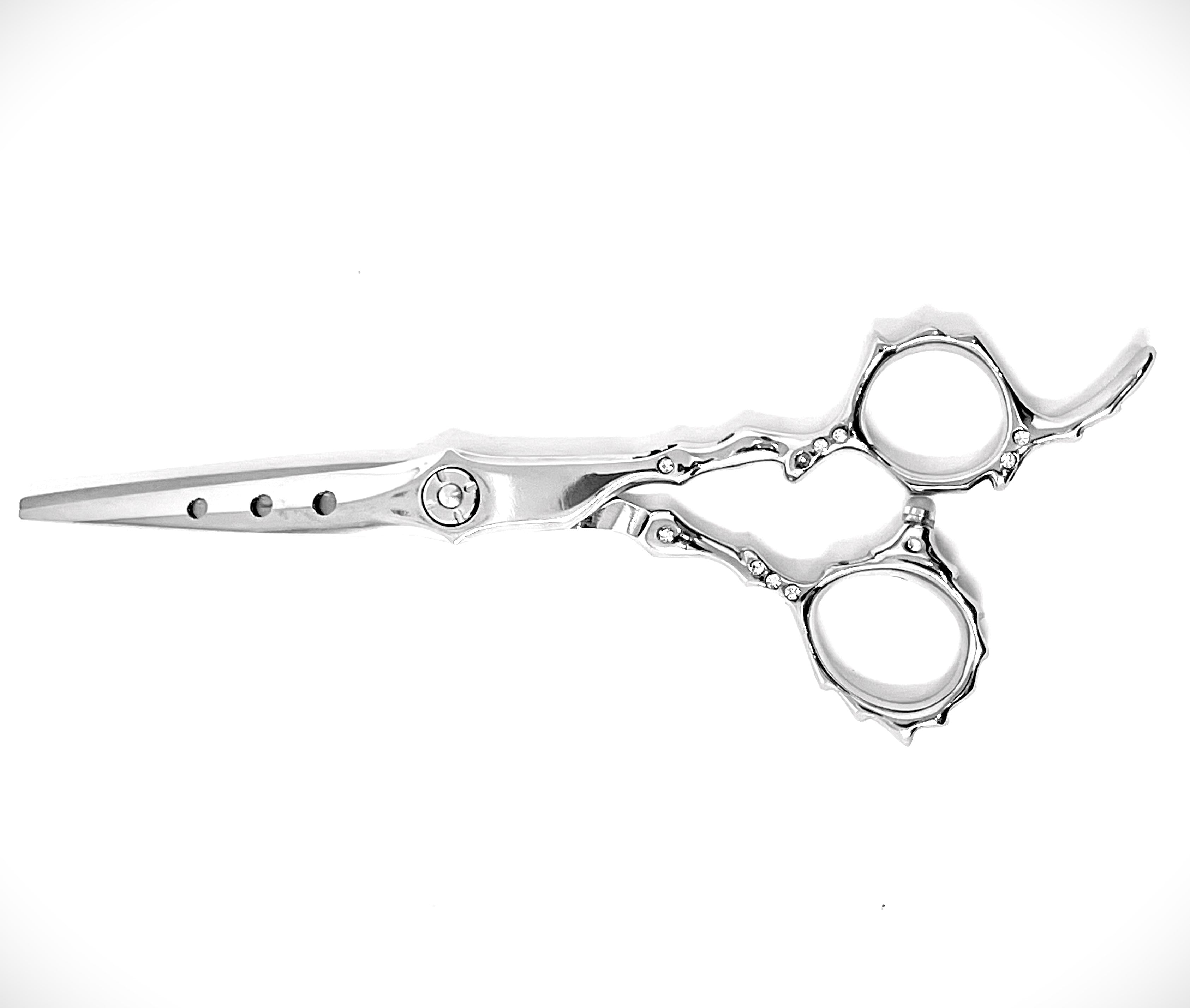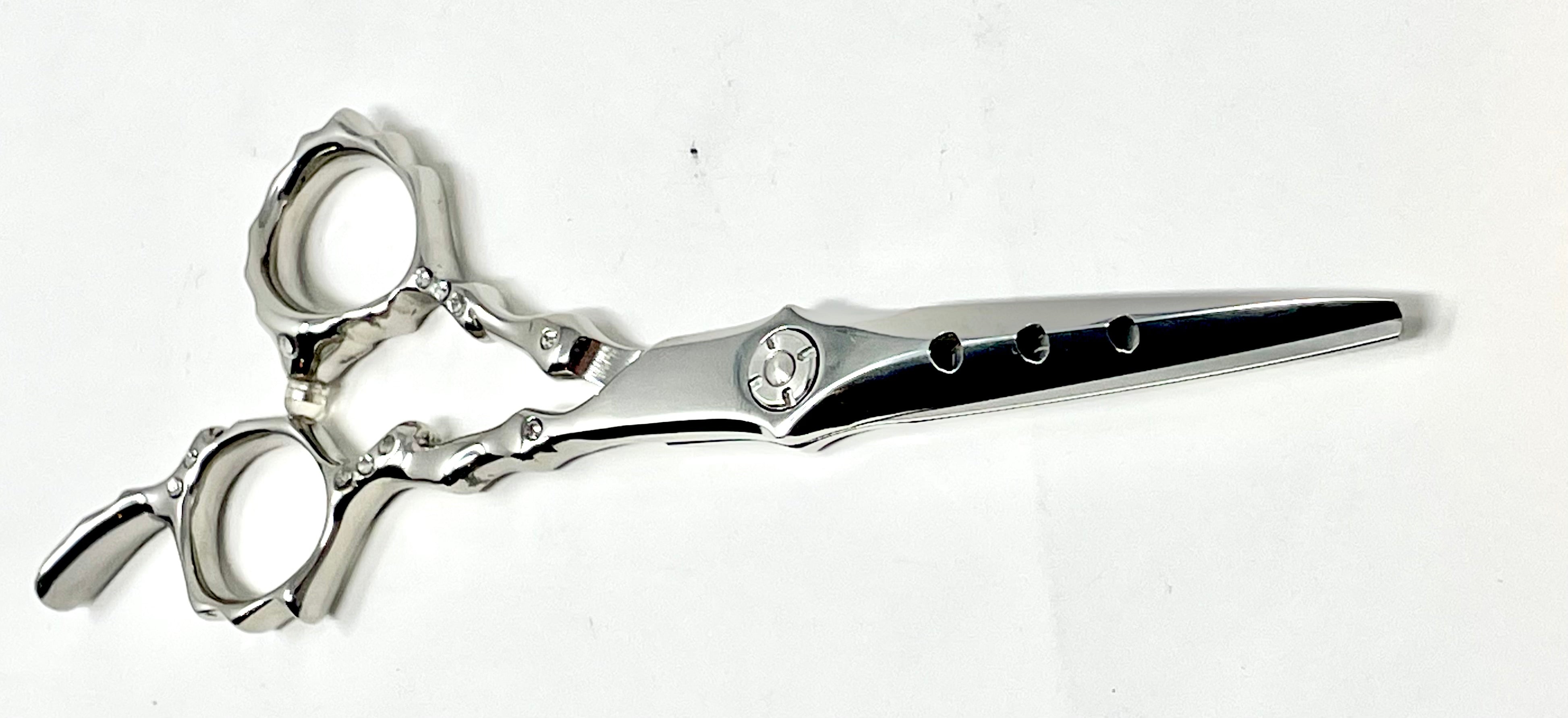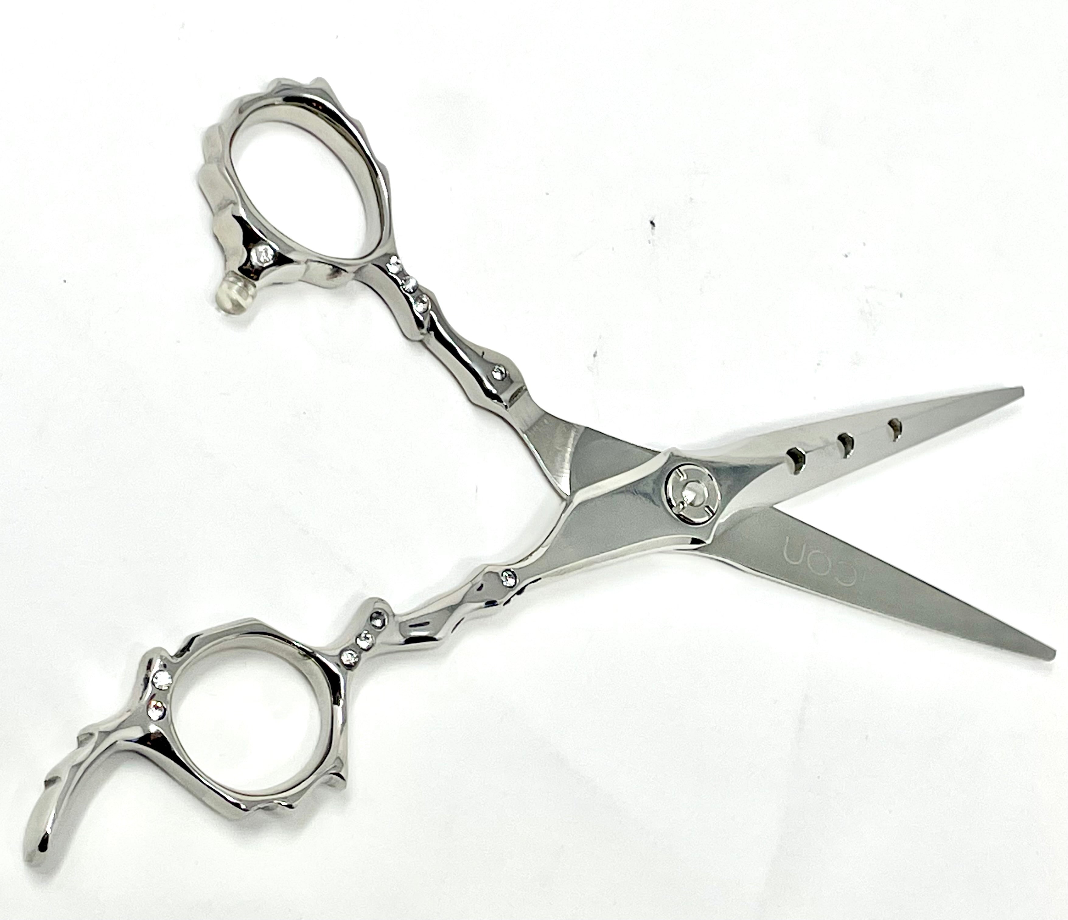 New product line for 2023!. 5.5" Chrome titanium point cutting shears. Diamond accents on handle, three hole accents on blade. Semi-convex razor sharp edge. These shears come with a one year blade/edge warranty which means you will enjoy one year of free unlimited sharpening. 100% handmade by our shears experts.