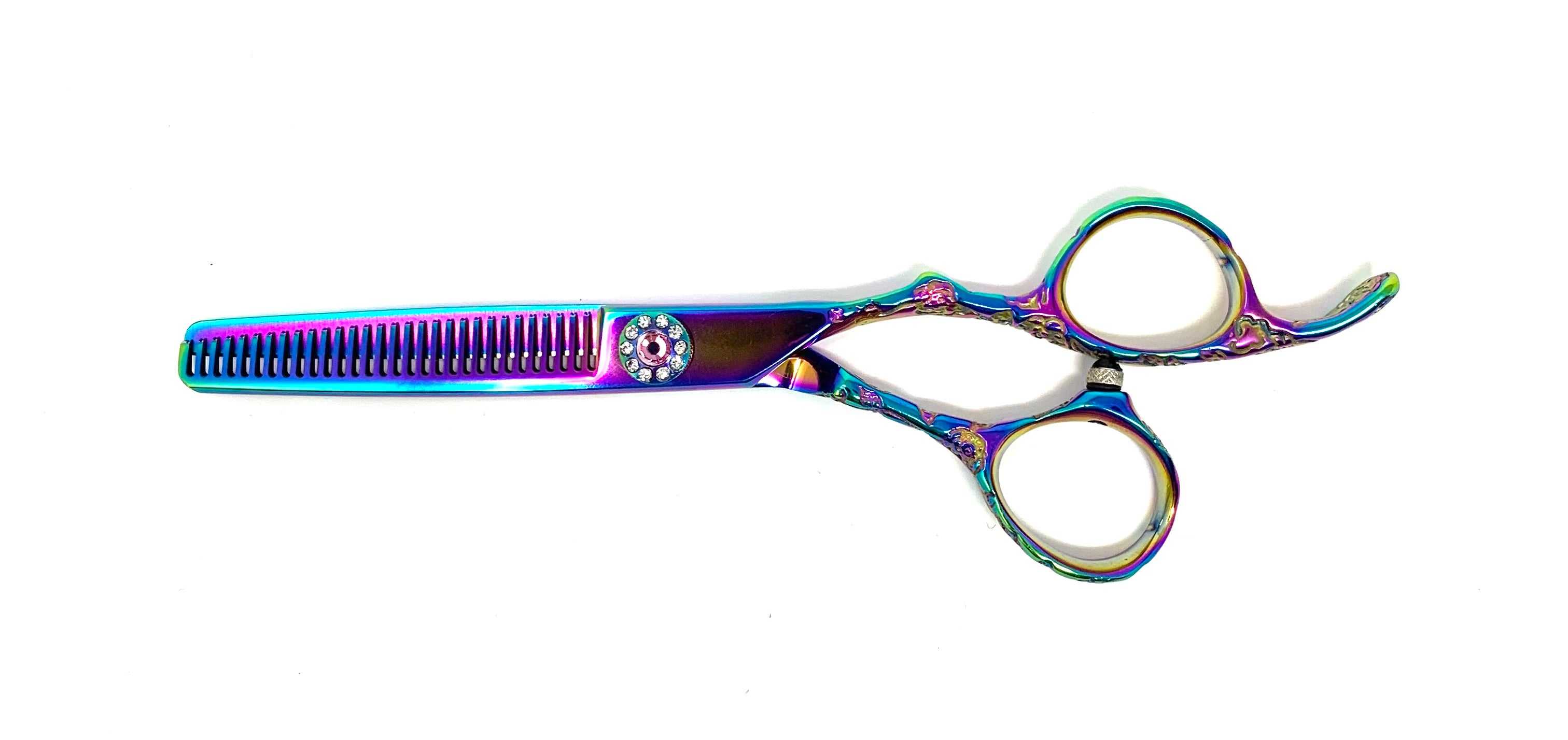 5.5” Multi-color thinning shear with fixed finger rest. Beautiful flowers imprinted on this offset handle. Well balanced with a very sharp semi-convex edge. These shears come with a one year blade/edge warranty with one year unlimited sharpening and a lifetime warranty towards any manufacturing defects. 100% handmade by our shears experts.