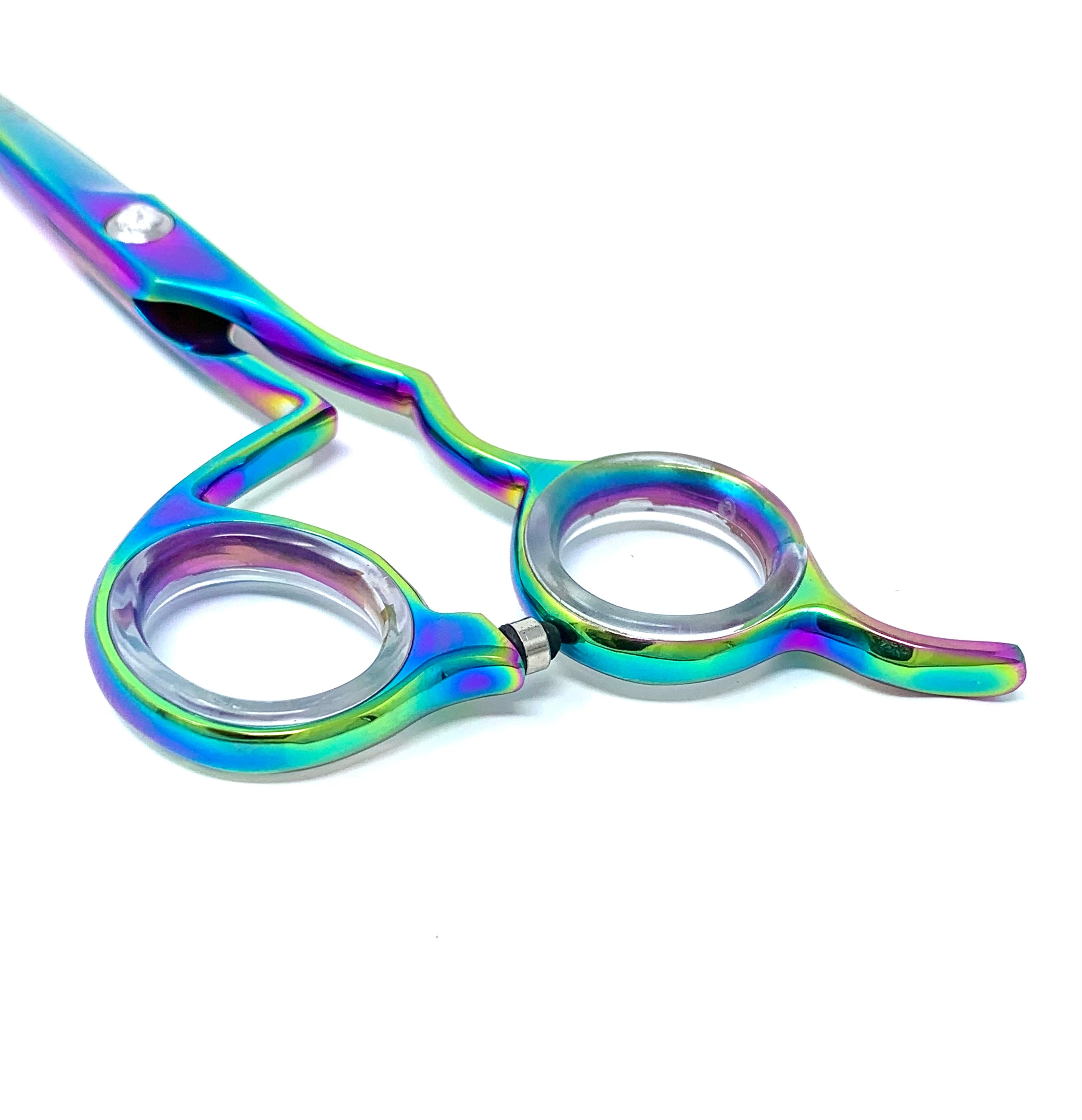 5.5" ICON Semi-convex razor sharp multi-color titanium coated shears. Super lightweight with an offset handle and a fixed finger rest. These shears come with a one year blade/edge warranty which means you will enjoy one year of free unlimited sharpening. 100% handmade by our shears experts.