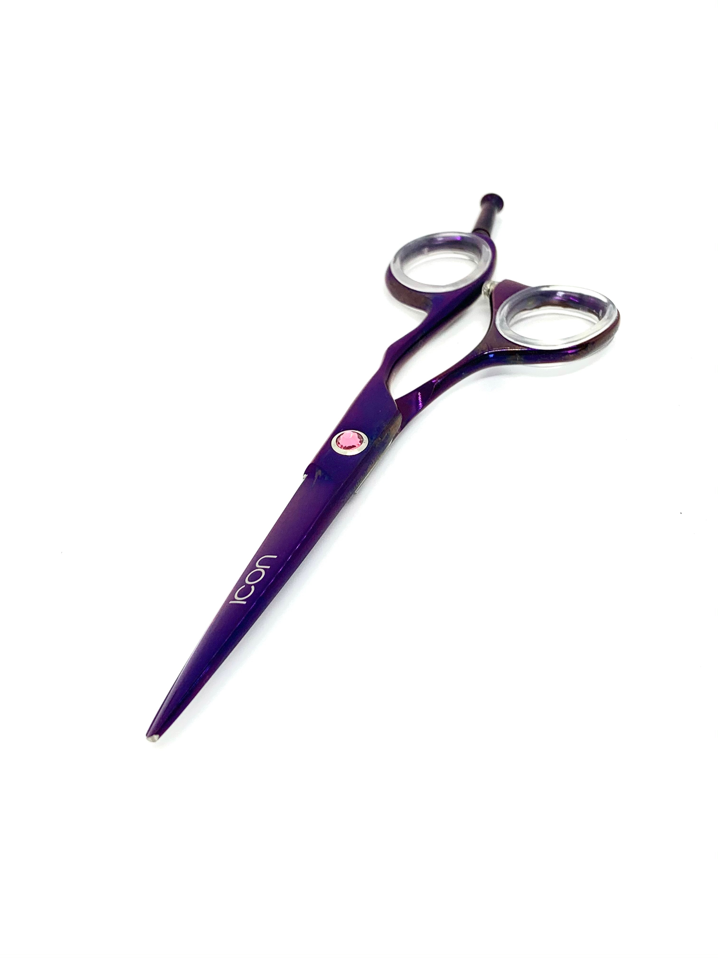 ICON 5.5" Purple shears with removeable finger rest. These shears have an offset handle and are well balanced with a very sharp semi-convex edge. These shears come with a one year blade/edge warranty with one year unlimited sharpening and a lifetime warranty towards any manufacturing defects. 100% handmade by our shears experts.