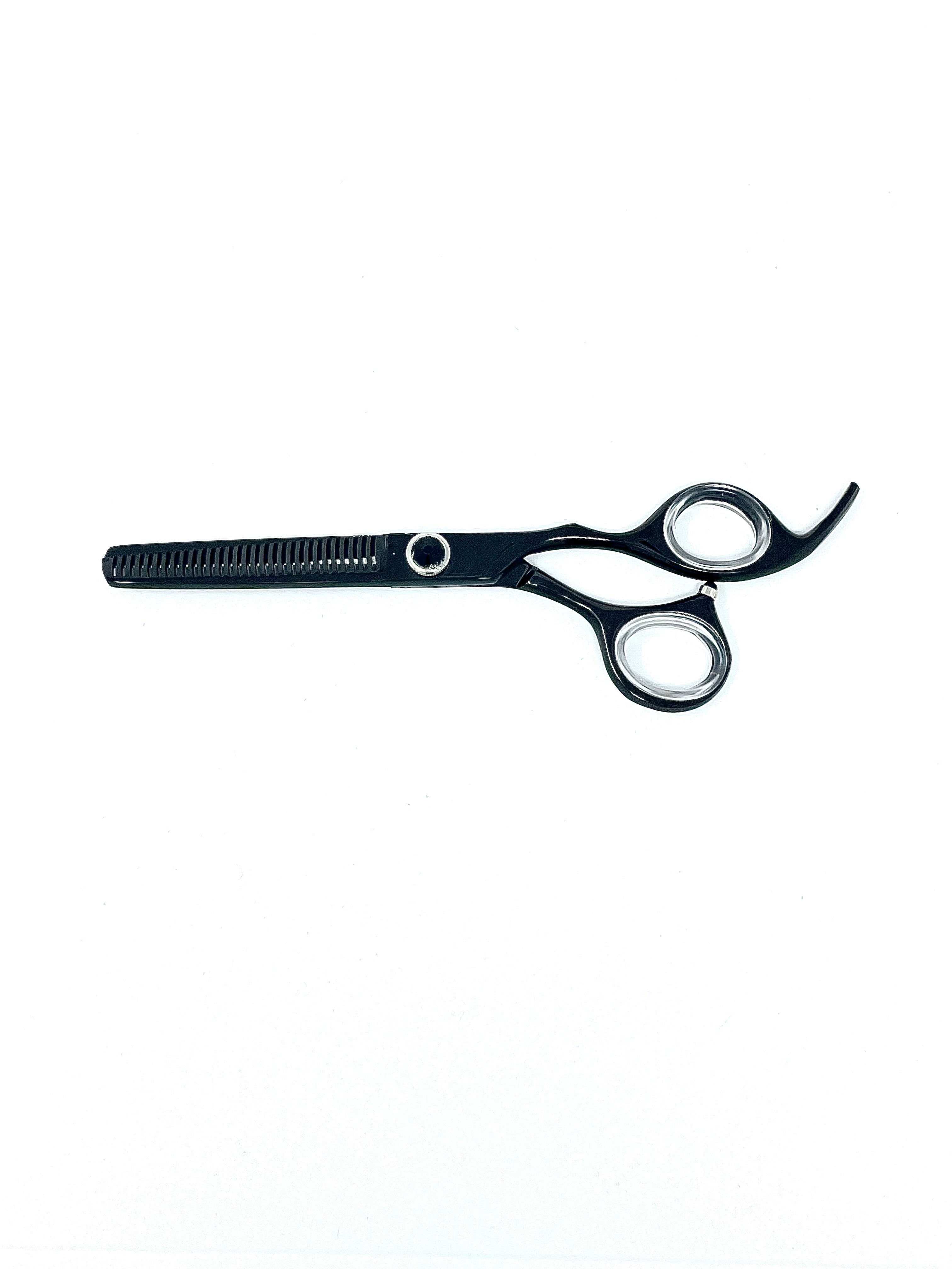 6.0" ICON Black thinning shears. These shears have an offset handle and are well balanced with a very sharp semi-convex edge. These shears come with a one year blade/edge warranty with one year unlimited sharpening and a lifetime warranty towards any manufacturing defects. 100% handmade by our shears experts.