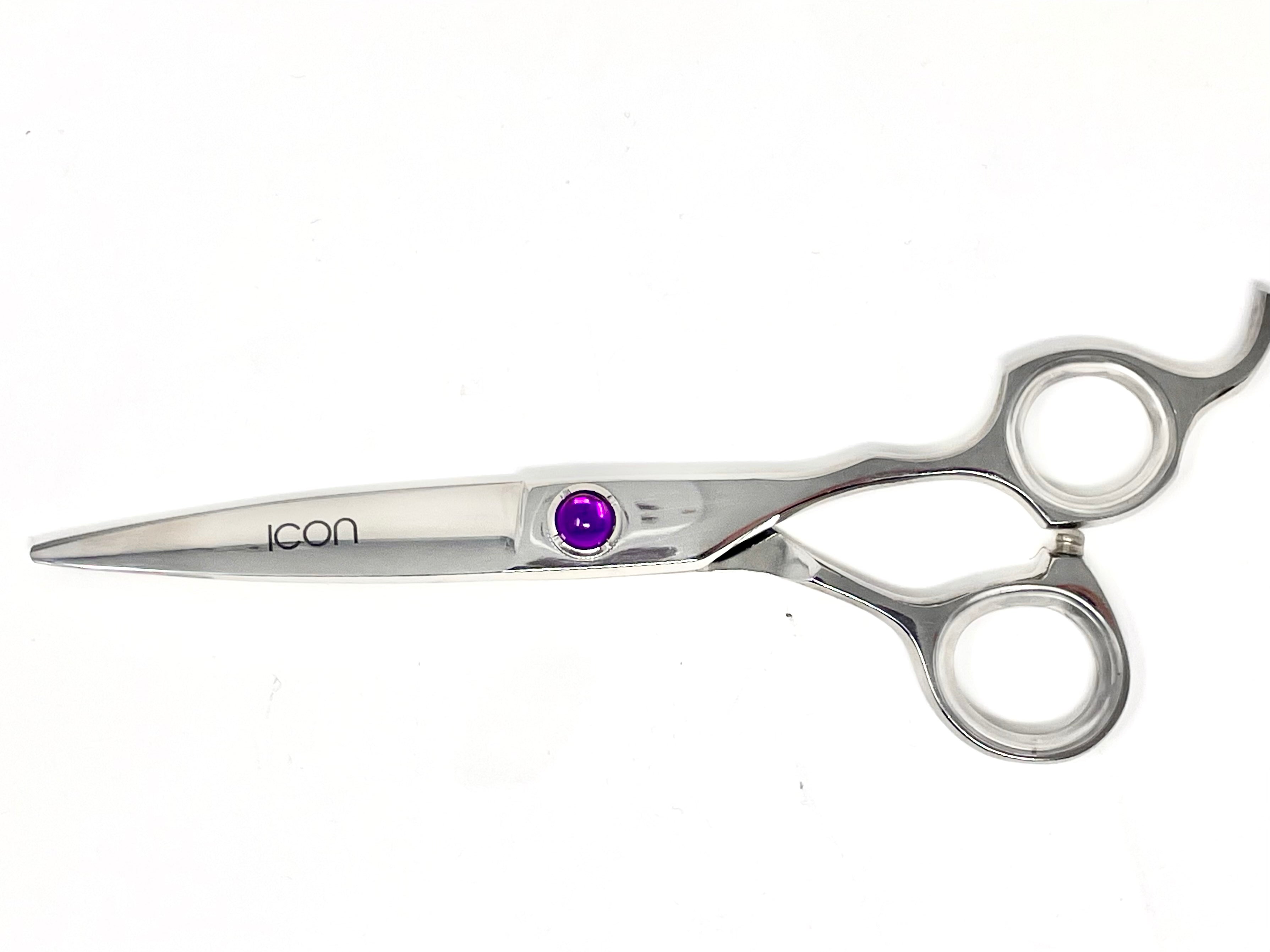 6.0" ICON Chrome titanium semi-convex razor sharp shears. These shears have a thick blade that is great for both wet and dry cuts. Very well designed with fixed finger rest. Comes with a one year blade/edge warranty which means you can enjoy free unlimited sharpening for one year. 100% handmade by our shears experts.