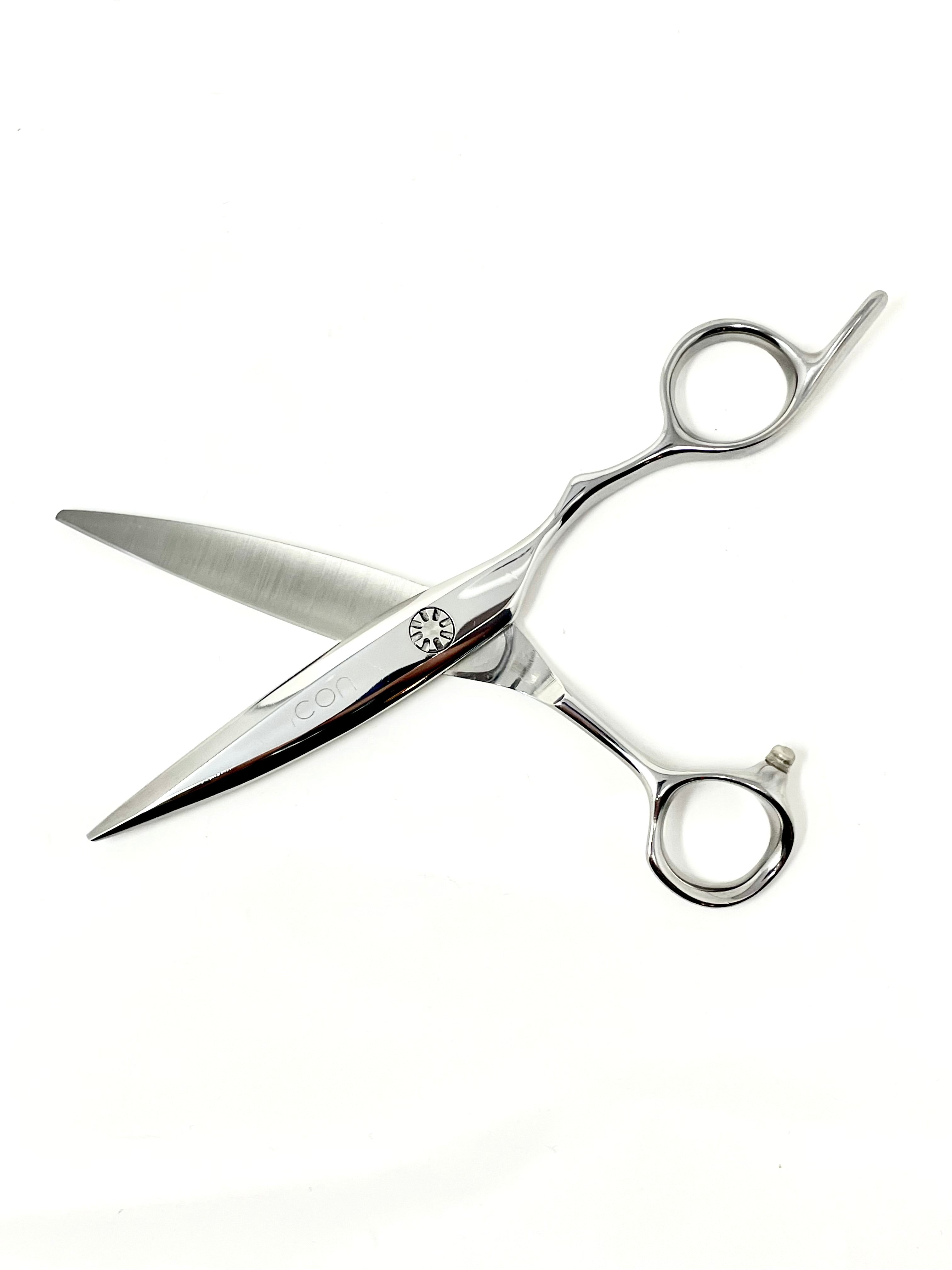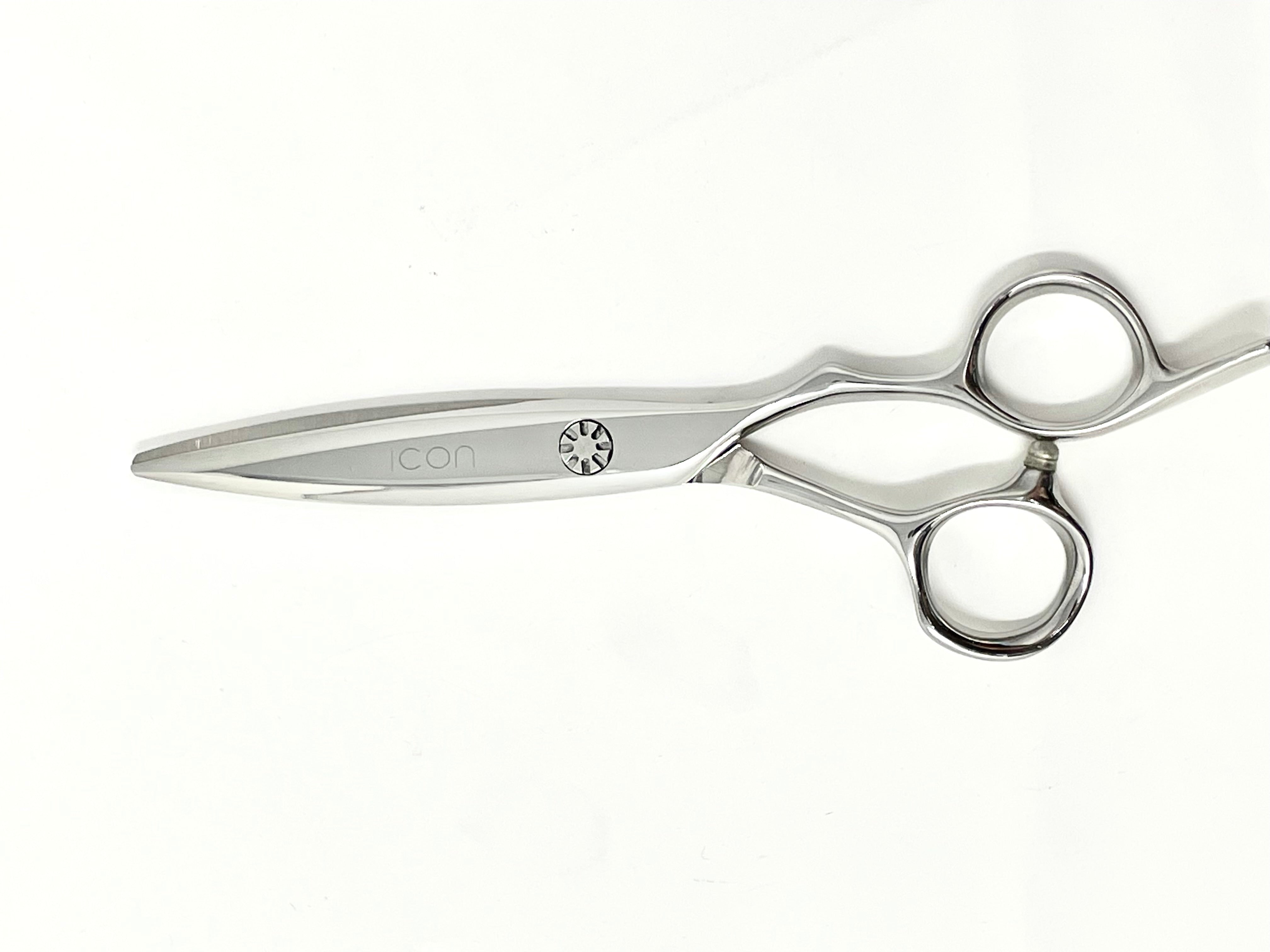 6.0" ICON Chrome shears with removeable finger rest. Great for dry cutting. These shears have an offset handle and are well balanced. Very sharp-semi convex edge. These shears come with a one year blade/edge warranty with one year unlimited sharpening and a lifetime warranty towards any manufacturing defects. 100% handmade by our shears experts.
