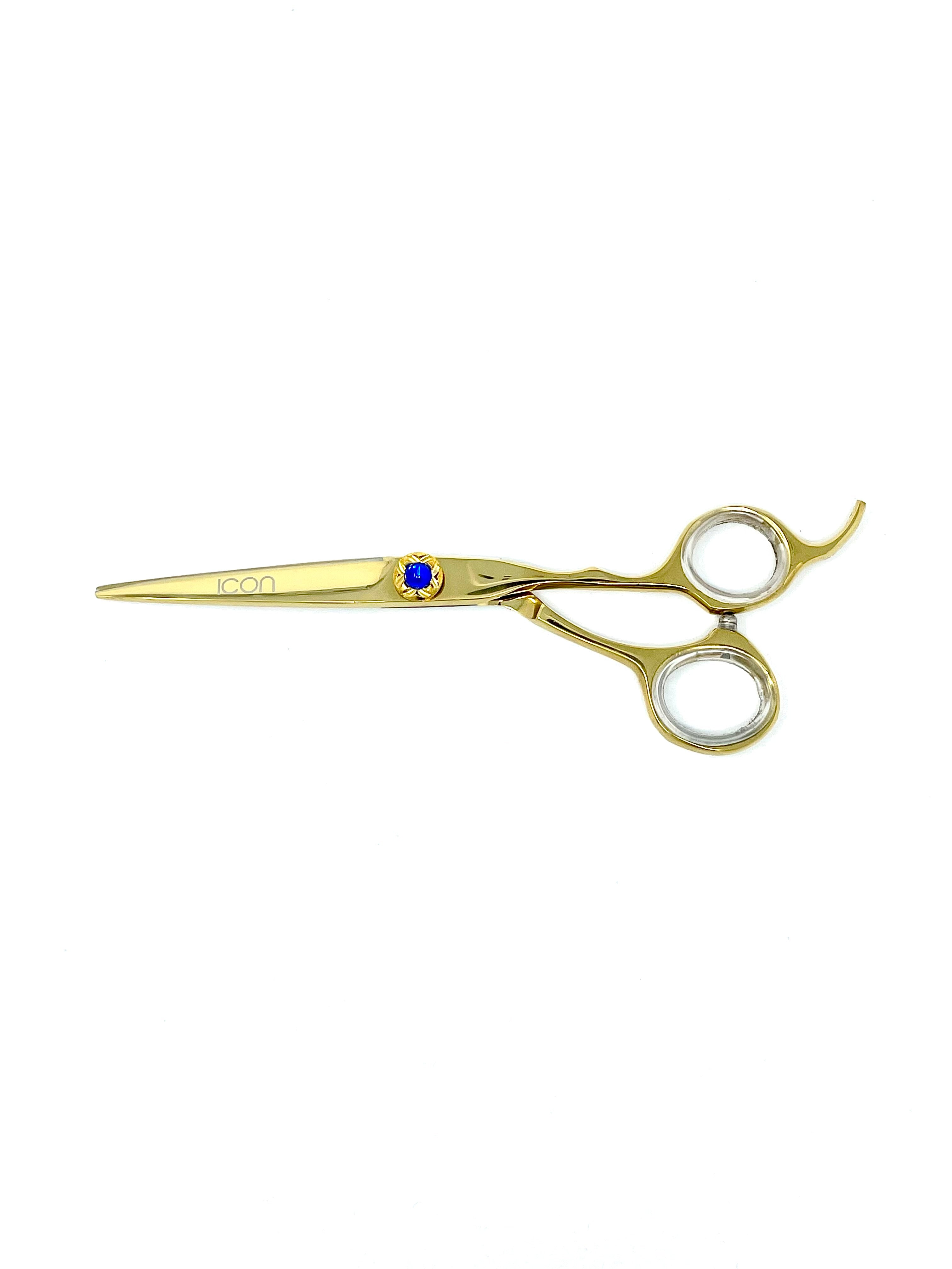 6" ICON Gold titanium coated semi-convex razor sharp hairstyling shears. These shears have a thick blade that is great for both wet and dry cuts. Very well designed with fixed finger rest. Comes with a one year blade/edge warranty which means you can enjoy free unlimited sharpening for one year. 100% handmade by our shears experts.