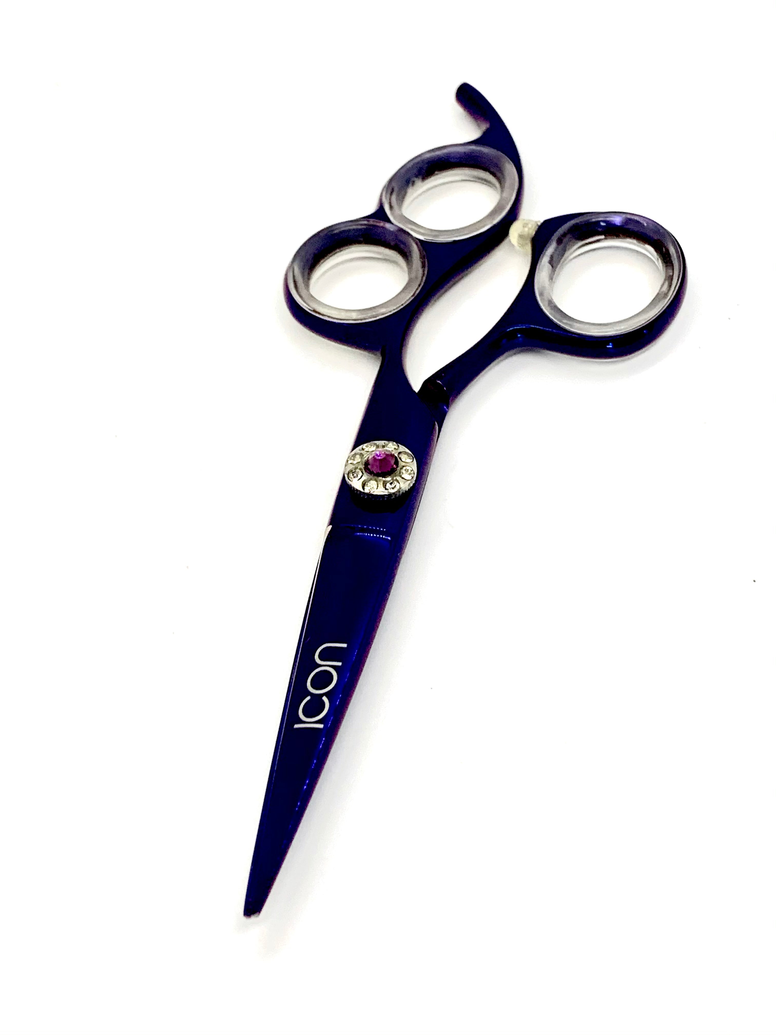 ICON 5.5" Purple three ring shears with fixed finger rest. These shears have an offset handle and are well balanced with a very sharp semi-convex edge. These shears come with a one year blade/edge warranty with one year unlimited sharpening and a lifetime warranty towards any manufacturing defects. 100% handmade by our shears experts.