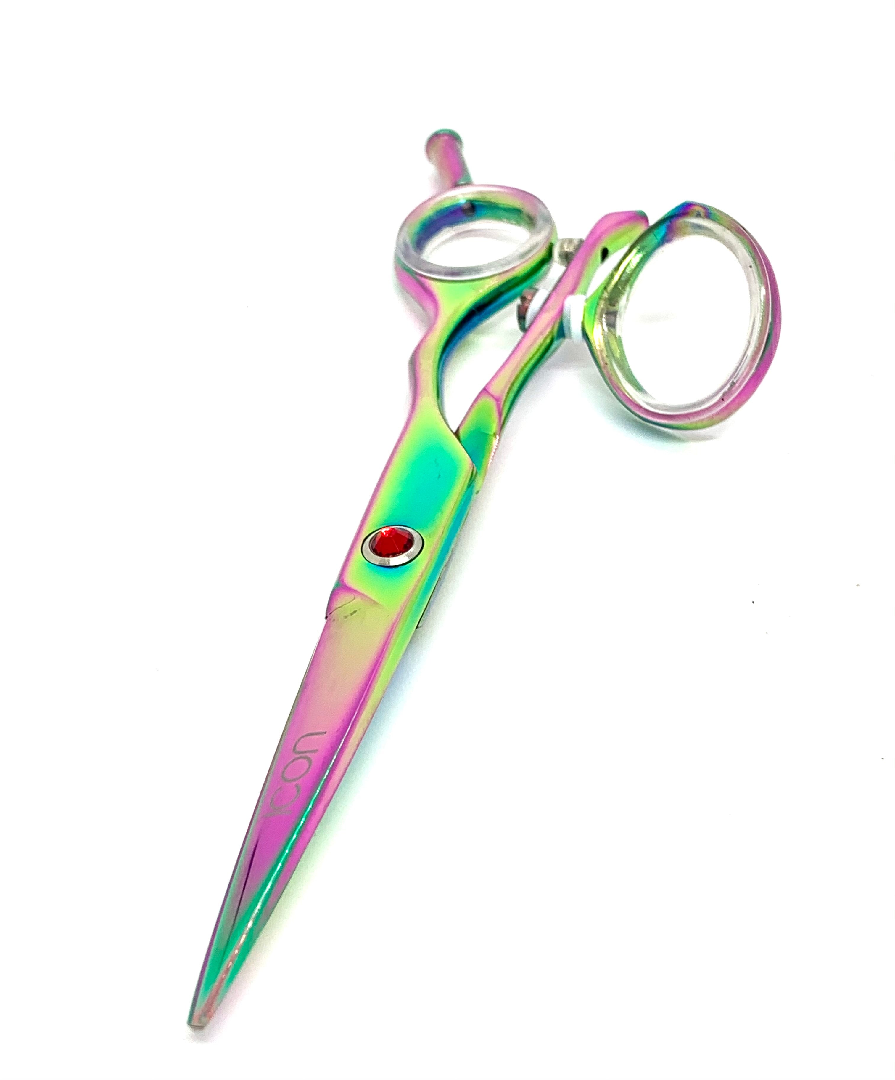 5.5" ICON Multi-color titanium coated semi-convex razor sharp shears. These shears have a thick blade that is great for both wet and dry cuts. Very well designed with removeable finger rest. Swivel thumb provides flexibility, comfort, and control for every cutting position. Comes with a one year blade/edge warranty which means you can enjoy free unlimited sharpening for one year. 100% handmade by our shears experts.