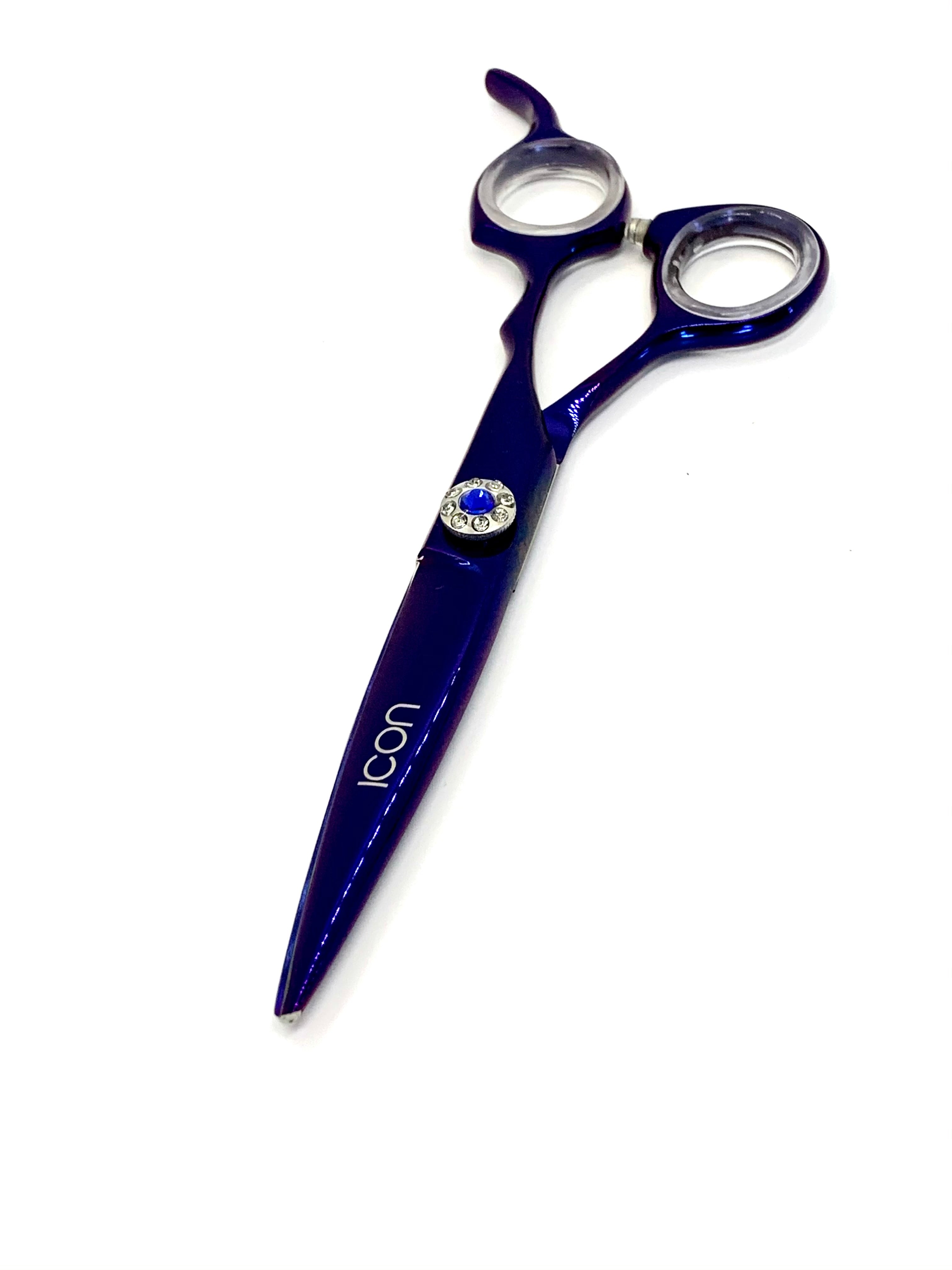 6" ICON Purple titanium coated semi-convex razor sharp shears. These shears have a thick blade that is great for both wet and dry cuts. Very well designed with a traditional handle and fixed finger rest. Comes with a one year blade/edge warranty which means you can enjoy free unlimited sharpening for one year. 100% handmade by our shears experts.